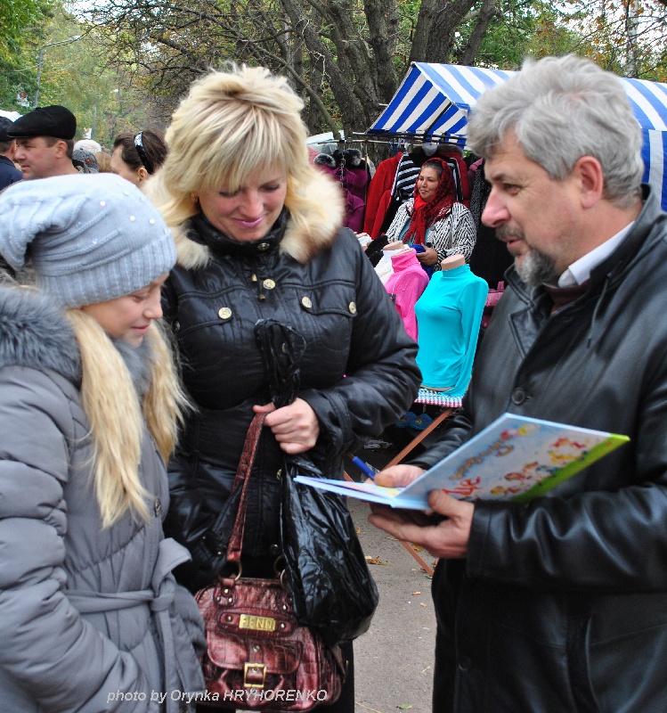 Художник Анатолій Риженко автографить на книзі "Це серйозно". Ніжин. Покровський ярмарок